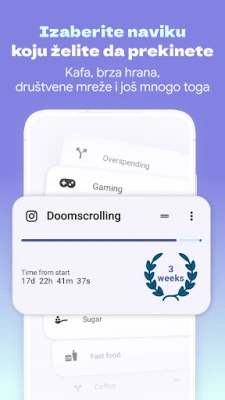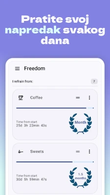 Freedom nudi sveobuhvatnu podršku za širok spektar izazova. Od prevazilaženja zavisnosti od nikotina ili alkohola, preko kontrole vremena provedenog u igrama i na internetu, do oslobađanja od kompulzivnih navika poput grickanja noktiju ili nezdravih prehrambenih obrazaca – ova aplikacija prilagođava se vašim potrebama. Njena ciklična logika omogućava održive promene, a umesto složenih funkcija, fokus je na jasnoći, doslednosti i merljivim rezultatima. Pravi preokret počinje prepoznavanjem, a uz Freedom, taj put postaje jednostavan, vizuelno privlačan i duboko motivišući, pomažući vam da ne vidite samo brojeve, već istinski napredak i bolji život. Vaša posvećenost, strpljenje i svest su ključevi, a Freedom je tu da vas podrži na svakom koraku.