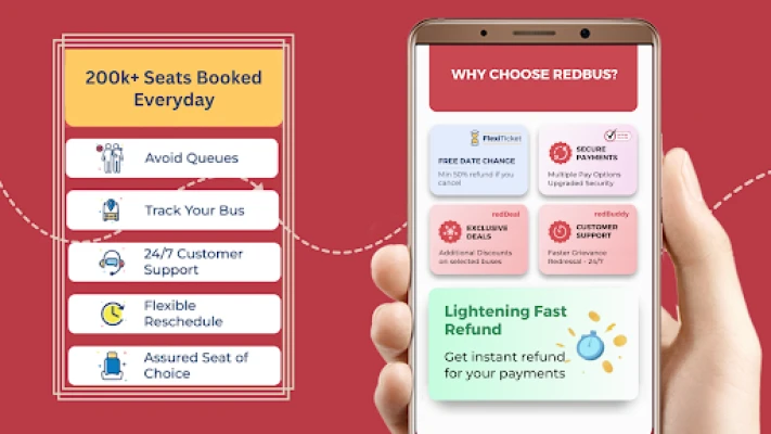 Ali redBus je više od puke rezervacije autobuskih karata. Proširite svoje mogućnosti putovanja uz redRail, našu partnersku aplikaciju ovlašćenu od strane IRCTC-a za rezervaciju voznih karata. Pristupite Tatkal rezervacijama, proverite status PNR-a i pratite vozove u realnom vremenu. Uz to, iskoristite opciju "Alternativno putovanje" koja vam garantuje potvrđene karte ili trostruki povrat novca. Ne dozvolite da se vaše putovanje završi bez smeštaja; redBus vam takođe pruža pristup ogromnoj mreži povoljnih hotela, hostela i smeštaja u preko 2000 gradova. Otkrijte najbolje ponude za više od 30.000 lokacija, potpomognute 100% verifikovanim ocenama korisnika, sve to uz 24/7 podršku.