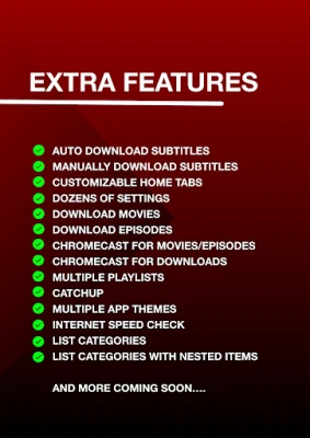 Unapredite svoj doživljaj uz obilje opcija za prilagođavanje. 9Xtream vam omogućava da personalizujete sve, od odabira tema do detaljnih podešavanja, uz podršku za više plejlista. Iskoristite moćne funkcije kao što su ChromeCast za prenos na veliki ekran, sveobuhvatni EPG TV programski vodič, intuitivni režim Slika-u-slici i efikasna Roditeljska kontrola, stvarajući bezbedno i prilagođeno okruženje. Za istinske ljubitelje filma i serija, 9Xtream pruža iscrpne informacije: trajanje, režisera, žanr, glumačku postavu sa slikama i biografije članova ekipe, produbljujući vaše uvide u svet zabave.