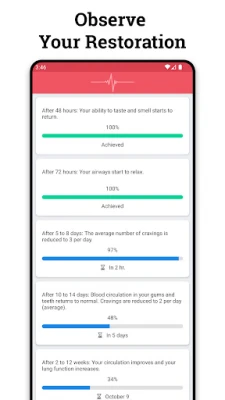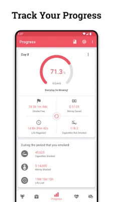 Uz Quit Tracker, dobijate jasan pregled svog napretka. Precizno pratite koliko ste blizu potpuno slobodnog života, koliku ste količinu novca uštedeli i koliko ste dragocenog vremena povratili. Interaktivna vremenska linija prestanka pušenja pruža vam dublji uvid u to kako se brzo vaše telo oporavlja i kakve sve benefite ostvarujete. Dozvolite da Quit Tracker postane vaš nezaobilazni alat za transformaciju, vodeći vas kroz svaki korak ka boljoj, zdravijoj budućnosti.