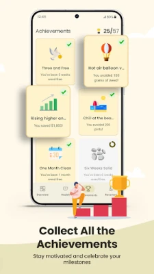 Uz Quit Weed, vaši napredak i postignuća su uvek na dohvat ruke. Detaljna statistika pruža jasan uvid u vaš uspeh: precizno pratite koliko je vremena prošlo od poslednje konzumacije, sve do sekunde. Otkrijte značajne finansijske uštede koje ostvarujete, kao i ukupnu količinu bilja ili THC-a koji ste izbegli, zahvaljujući opciji unosa jačine. S lakoćom beležite svaku preskočenu konzumaciju, bilo da je reč o džointu, bongi ili jestivoj formi, čak i više metoda odjednom, za najtačniji prikaz vašeg odricanja.
